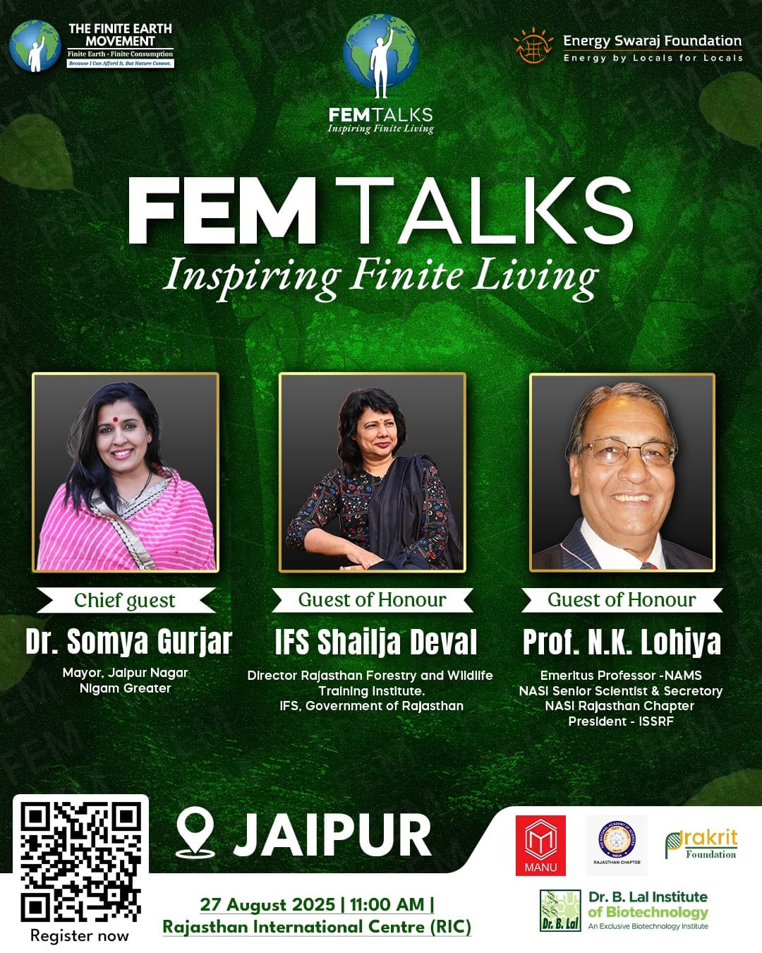 An inspiring initiative by the Energy Swaraj Foundation under the Finite Earth Movement, the First FEM Talks is set to launch on 27th August 2025 at the Rajasthan International Centre (RIC), Jaipur.